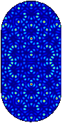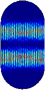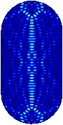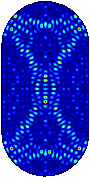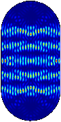Sannolikhetsfördelning för några stationära tillstånd - mörk färg svarar mot liten sannolikhet, ljus mot stor, och rött indikerar maximal sannolikhet. De fyra första bilderna indikerar “ärrbildning”, den sista approximativt likformig fördelning.